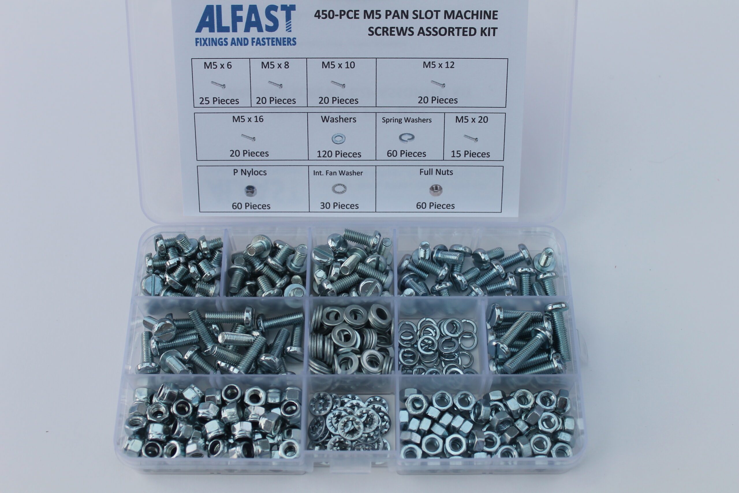 450 Piece Kit containing an assortment of zinc plated M5 Pan Slot Machine Screws DIN85, Nuts and Washers.