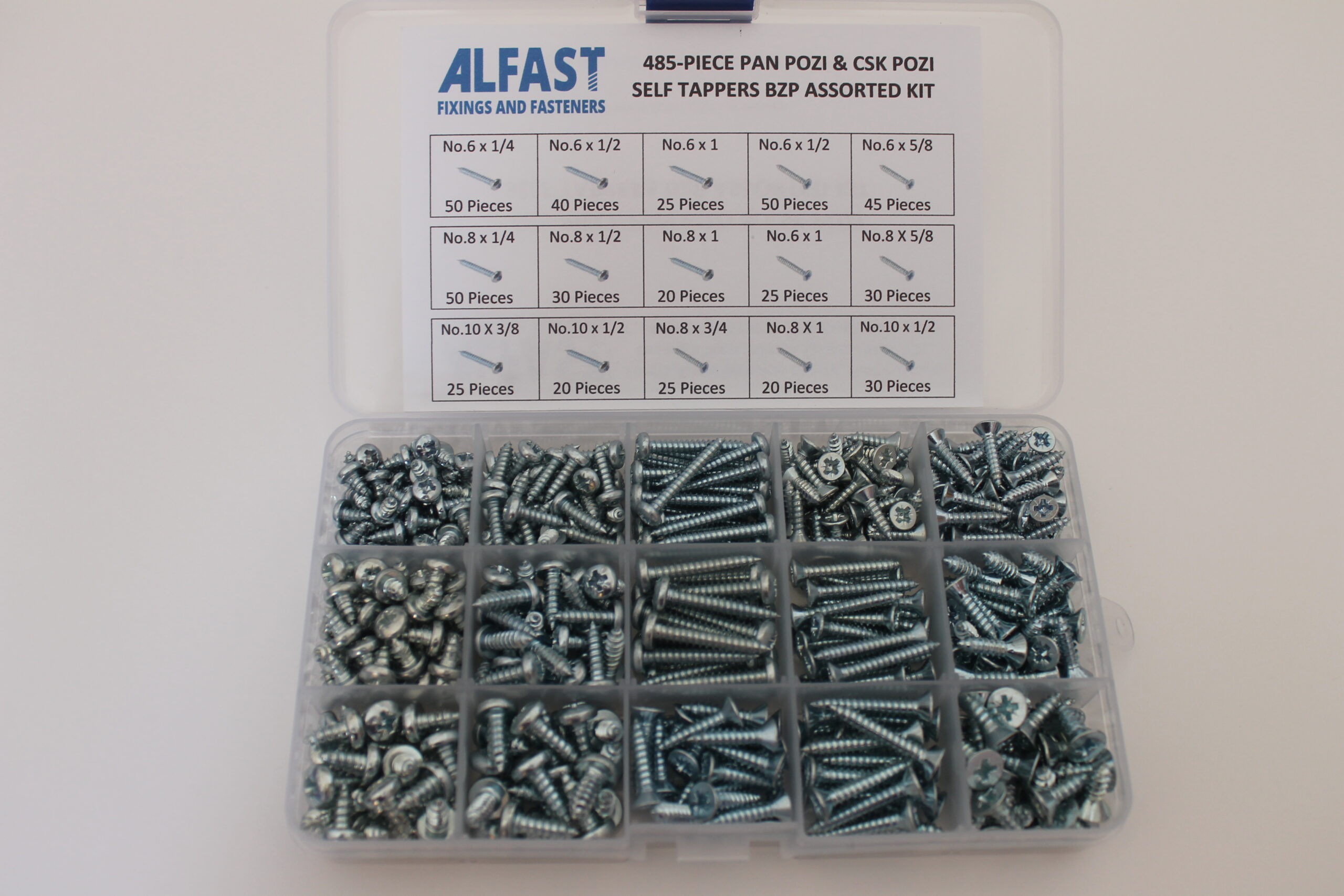 485 Piece Kit containing an assortment of No.6, No.8 and No.10 zinc plated Pan Pozi DIN7981C and CSK Pozi Self Tapping Screws DIN7982C.